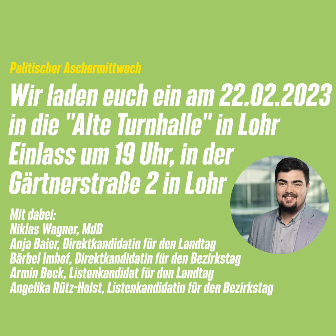 Der Grüne Kreisverband Main-Spessart und der Ortsverband Lohr am Main laden herzlich nach Lohr zum Politischen Aschermittwoch ein! Mit dabei Bezirksrätin Bärbel Imhof, Angelika Rütz-Holst (Listenkandidatin Bezirkswahl 2023), Stadt- und Kreisrätin Anja Baier (Direktkandidatin Landtagswahl 2023) und Armin Beck (Listenkandidat Landtagswahl 2023) und viele andere Gäste. Die politische Rede wird Niklas Wagener halten.