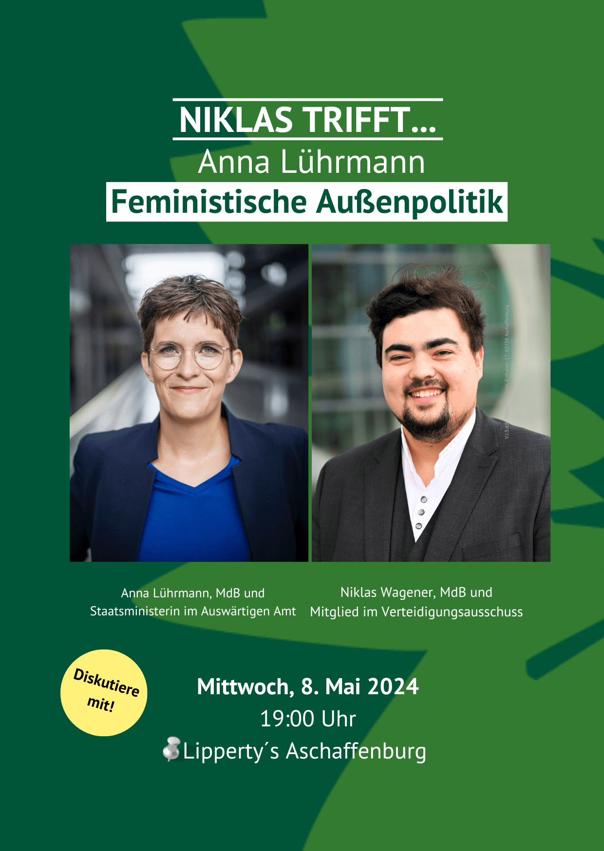 Diese und andere Fragen diskutieren der Aschaffenburger Bundestagsabgeordnete Niklas Wagener und Anna Lührmann, Staatsministerin für Europa und Klima im Auswärtigen Amt.