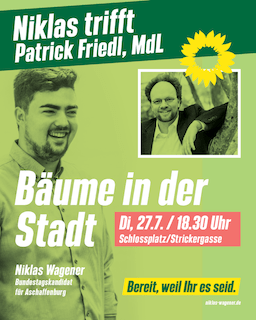 Niklas trifft Patrick Friedl MdL – Bäume in der Stadt Datum: 27. Juli Zeit: 18:30 – 20:00 Ort: Schloßplatz/Strickergasse Dienstag27.07.202118:30 - 20:00 UhrSchloßplatz/StrickergasseStrickergasse63739 Aschaffenburgorganisiert von Grüne AschaffenburgDownload als ics-Datei