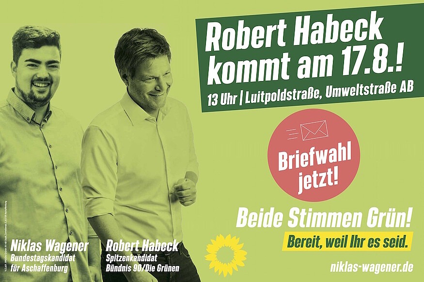 Auf seiner Wahlkampftour macht unser Grüner Parteivorsitzender Robert Habeck in Aschaffenburg Station: Die gemeinsame Veranstaltung der Grünen Kreisverbände Aschaffenburg-Stadt und -Land beginnt am Dienstag, 17. August, um 13 Uhr in der Aschaffenburger Luitpoldstraße vor dem Volkshochschulgebäude.