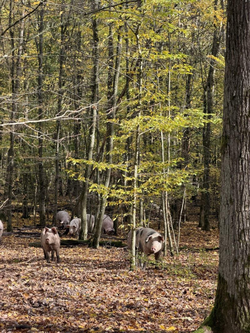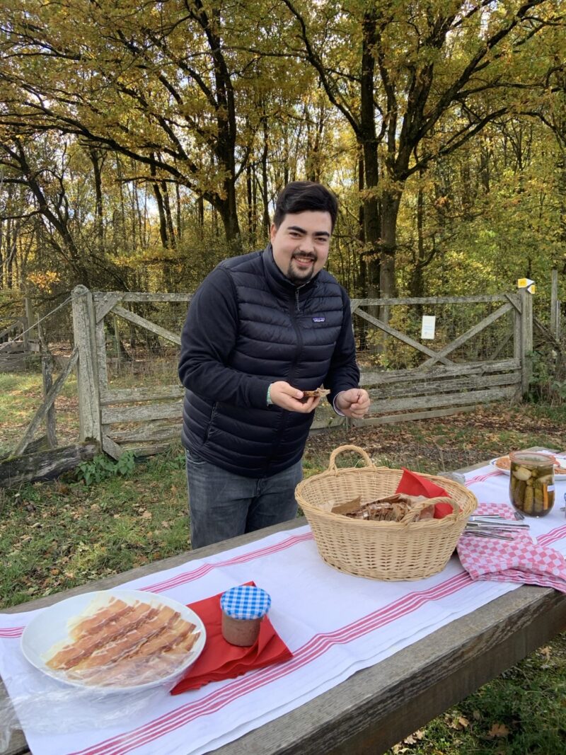 Rainer Fell, der das Projekt unterstützt und mit angestoßen hat: „Die Eichelschweine sind ein Paradebeispiel für symbiotische Landnutzung. Die Waldbewirtschaftung ruht hier für etwa fünf Jahre, doch das Ökosystem profitiert: Rotwild und Schweine leben friedlich nebeneinander, und die Tourist*innen sind begeistert von den neugierigen Tieren, die bis an den Zaun kommen.“ Die Exkursion endete mit einer kleinen Verkostung des Eichelschinkens, begleitet von einem Glas fränkischem Bocksbeutel – eine Hommage an die regionale Identität.
